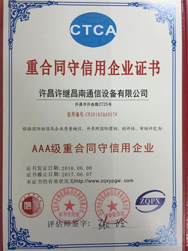 近日,我公司獲評 “企業(yè)信用評價AAA級信用企業(yè)”、“重合同守信用企業(yè)”,這是公司關(guān)于重量級誠信評價的榮譽。誠信是企業(yè)的立身之本,許昌許繼昌南通信設(shè)備有限公司自成立以來,始終堅持誠信為本的經(jīng)營原則,不斷加強和完善質(zhì)量監(jiān)控體系及安全生產(chǎn)管理,以優(yōu)異的產(chǎn)品質(zhì)量得到了廣大客戶的一致好評,無論是市場競爭力、產(chǎn)品認可度還是企業(yè)知名度都在不斷提升。多年來公司始終堅持打造誠信發(fā)展平臺,不斷開創(chuàng)誠信經(jīng)營新局面,為營造誠實守信、公平競爭的市場環(huán)境做出積極貢獻。