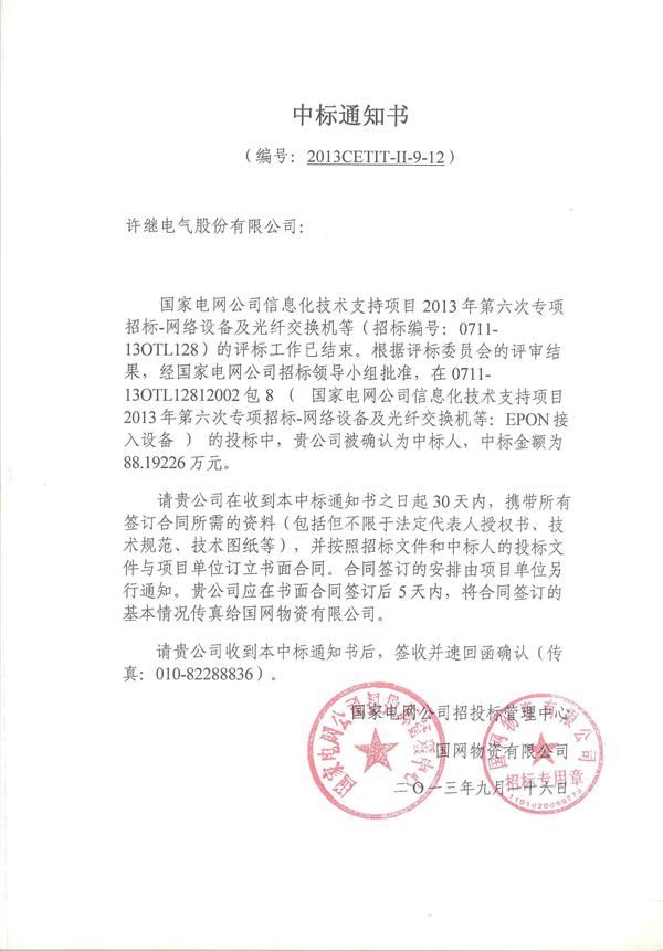中標(biāo)河南省電力公司2013年第三批物質(zhì)協(xié)議庫(kù)存招標(biāo)采購(gòu)
