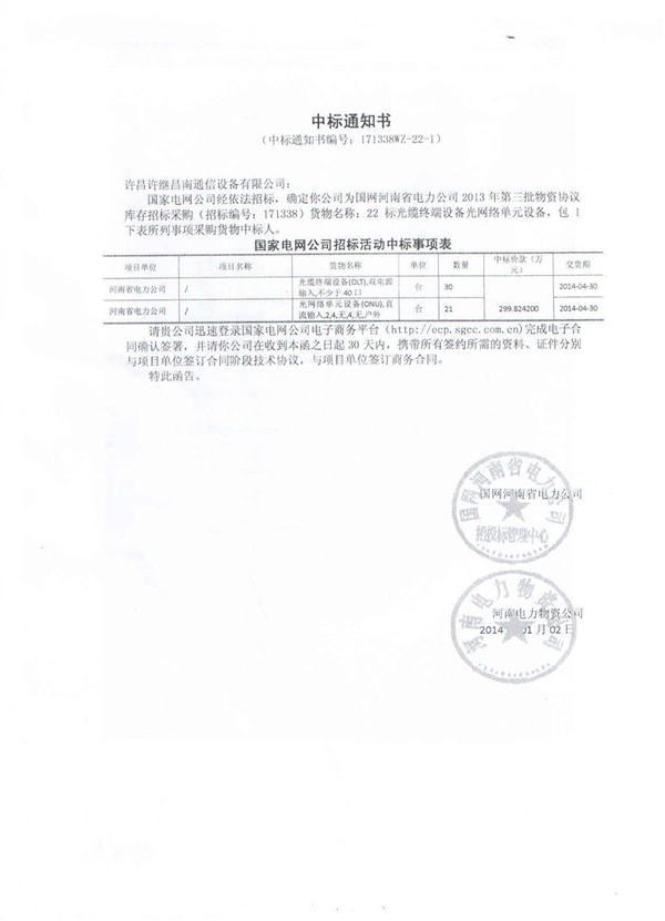 中標(biāo)河南省電力公司2013年第三批物質(zhì)協(xié)議庫存招標(biāo)采購