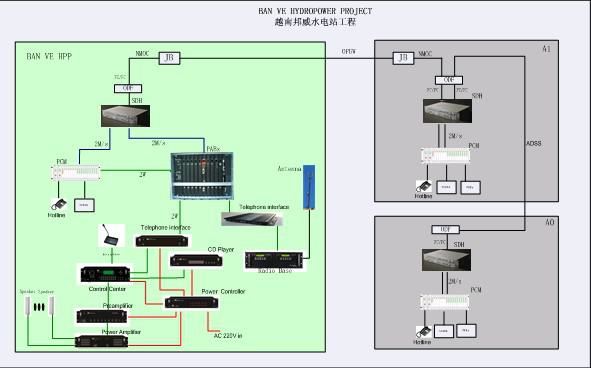 越南邦威水電站項(xiàng)目,單機(jī)容量160MW,總裝機(jī)容量為320MW,由四川東方電力設(shè)備聯(lián)合公司承建,許繼昌南通信公司負(fù)責(zé)全廠通信系統(tǒng)的設(shè)計(jì)、供貨、現(xiàn)場(chǎng)安裝調(diào)試工作。通信系統(tǒng)設(shè)備包括:光纖通信系統(tǒng)、調(diào)度程控交換系統(tǒng)、無(wú)線對(duì)講系統(tǒng)、通信電源系統(tǒng)、公共廣播系統(tǒng)、視頻監(jiān)控系統(tǒng)、泄洪報(bào)警系統(tǒng)。